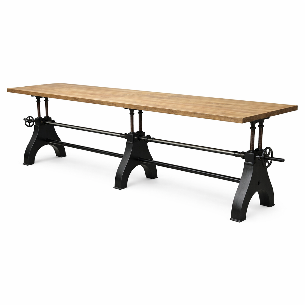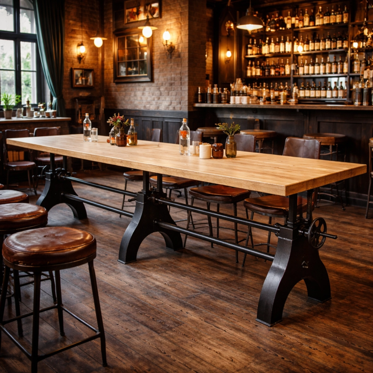 Dit robuuste, industrieel tafelonderstel Atlanta XL is voorzien van een eiken tafelblad. Dankzij het handige opdraaimechanisme is de tafel eenvoudig in hoogte verstelbaar – ideaal voor horeca, maar ook perfect in een landelijk of industrieel interieur.
