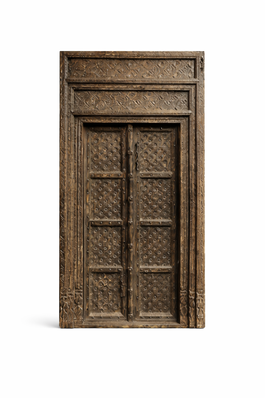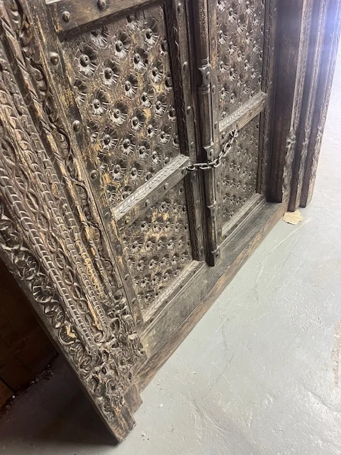 De deuren zijn afkomstig uit India uit de 20e eeuw. Massief hout met metalen accenten Afmetingen: 280 x 140 cm. Deze deuren zijn in goede vintage staat, met sporen van gebruik die bijdragen aan de charme.