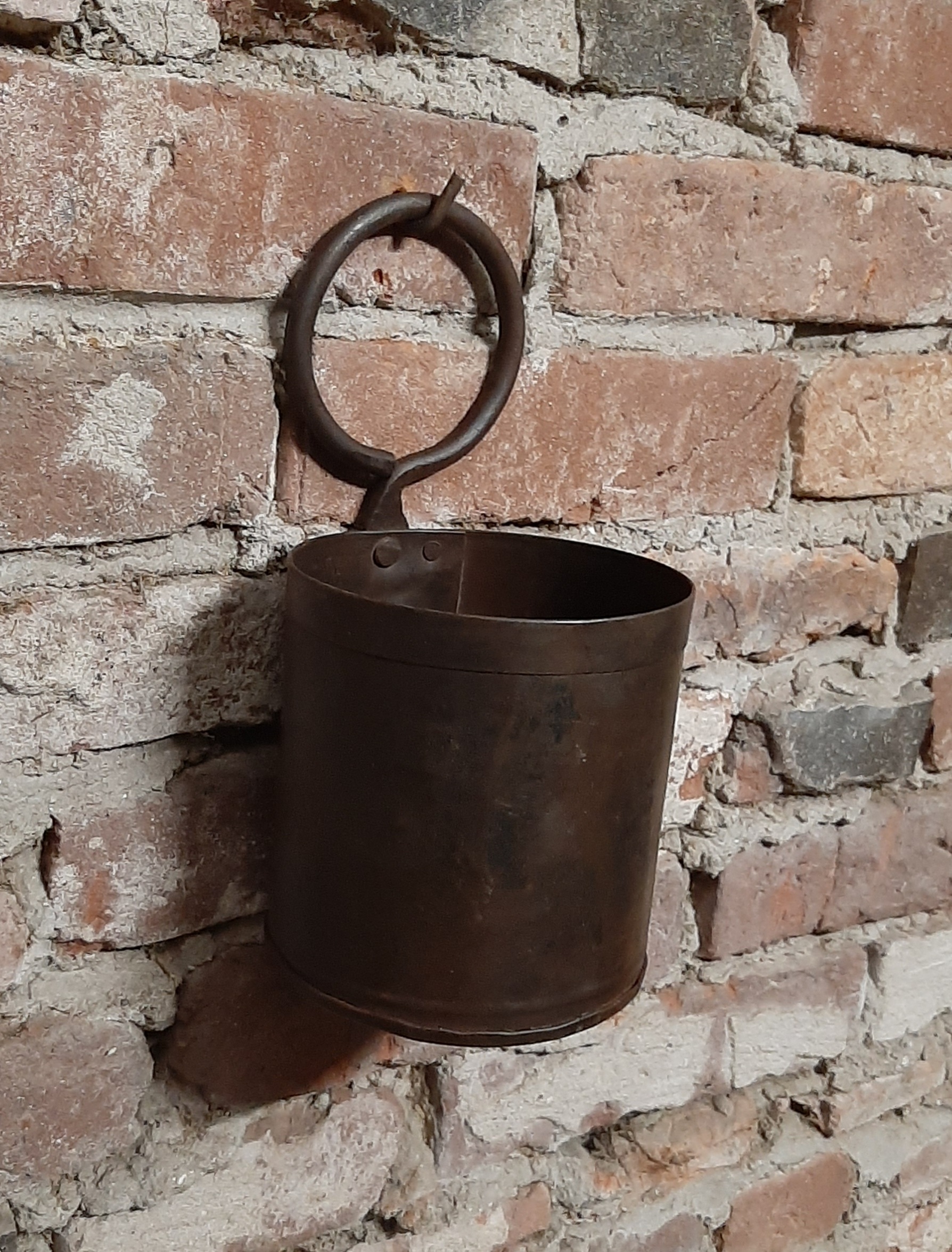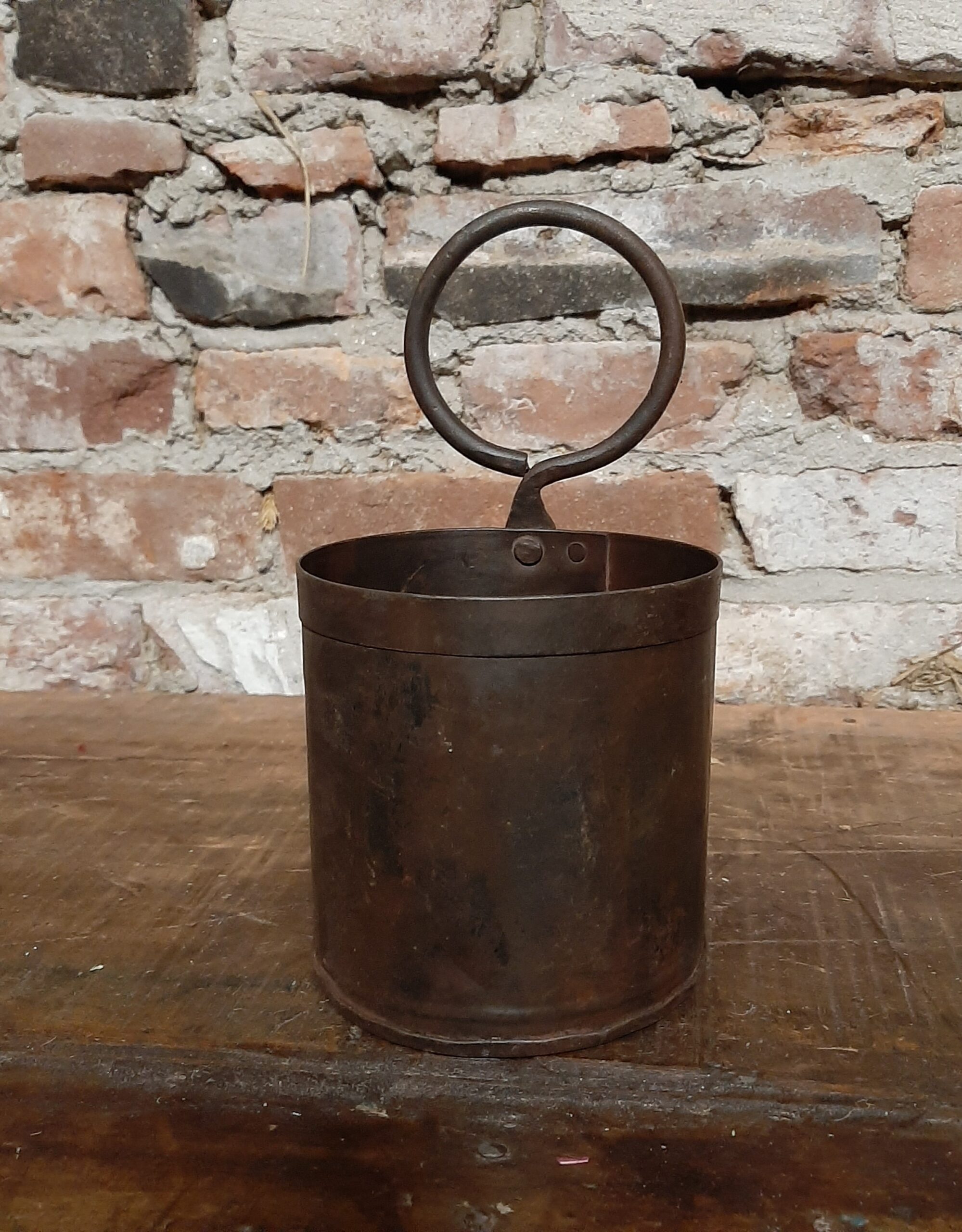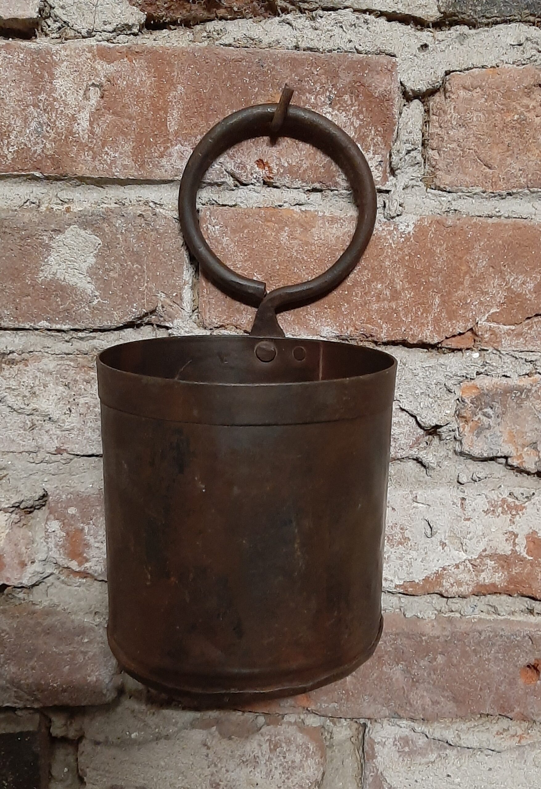 Stoer metalen potje met authentieke roestlook en stevig oog. Ideaal als pennenbakje op je bureau of als decoratieve opberger in een industrieel, landelijk of vintage interieur. Praktisch, compact en sfeervol.