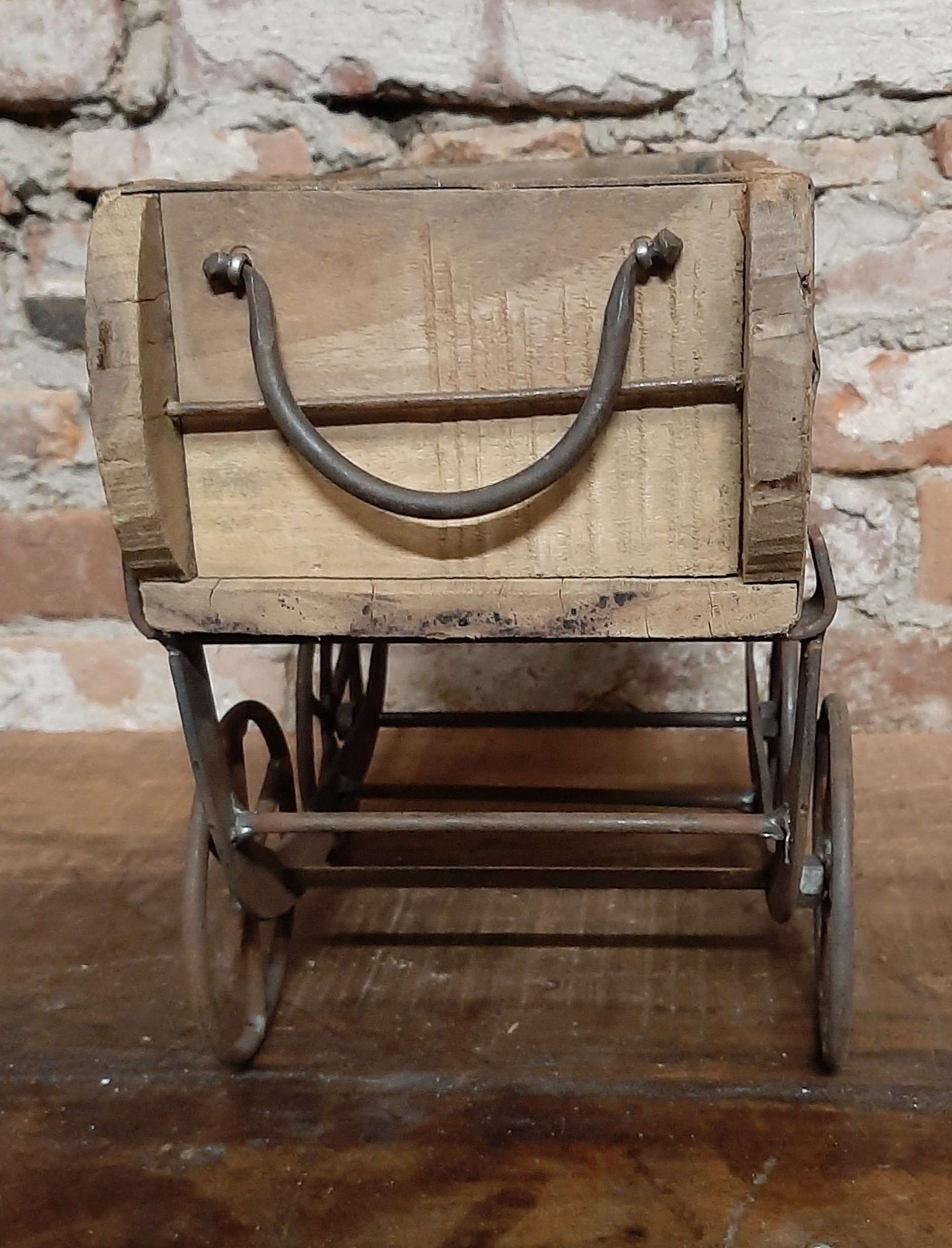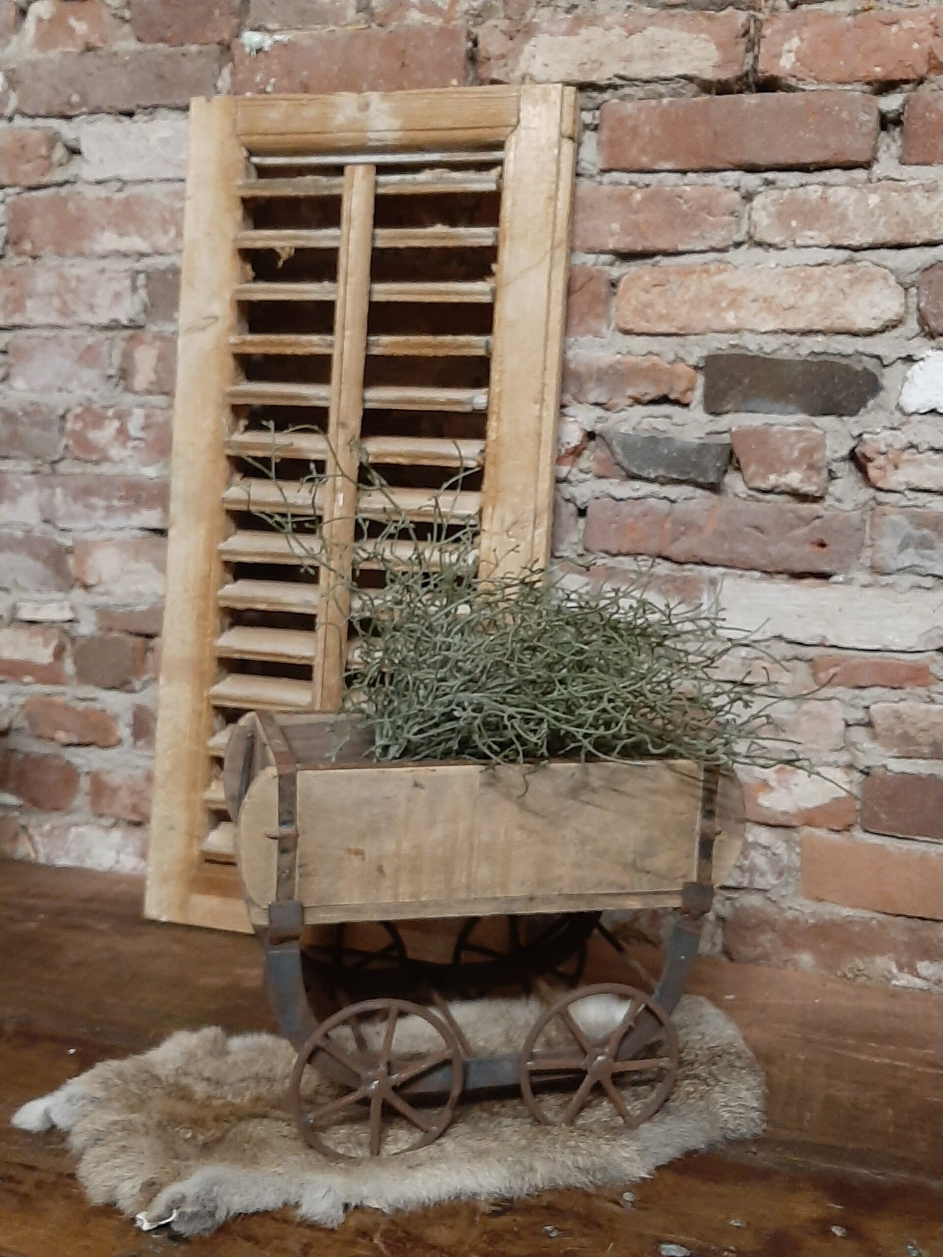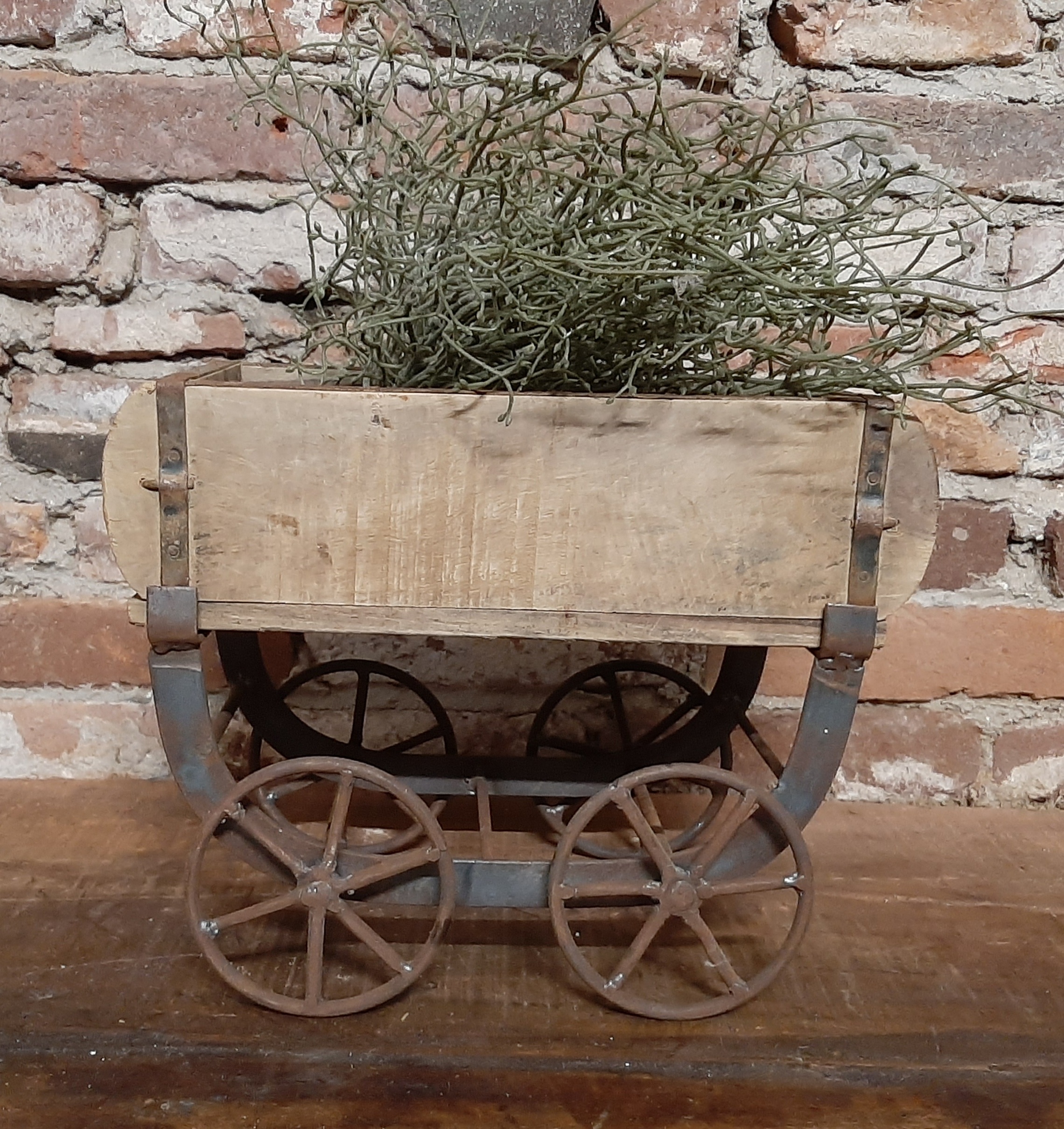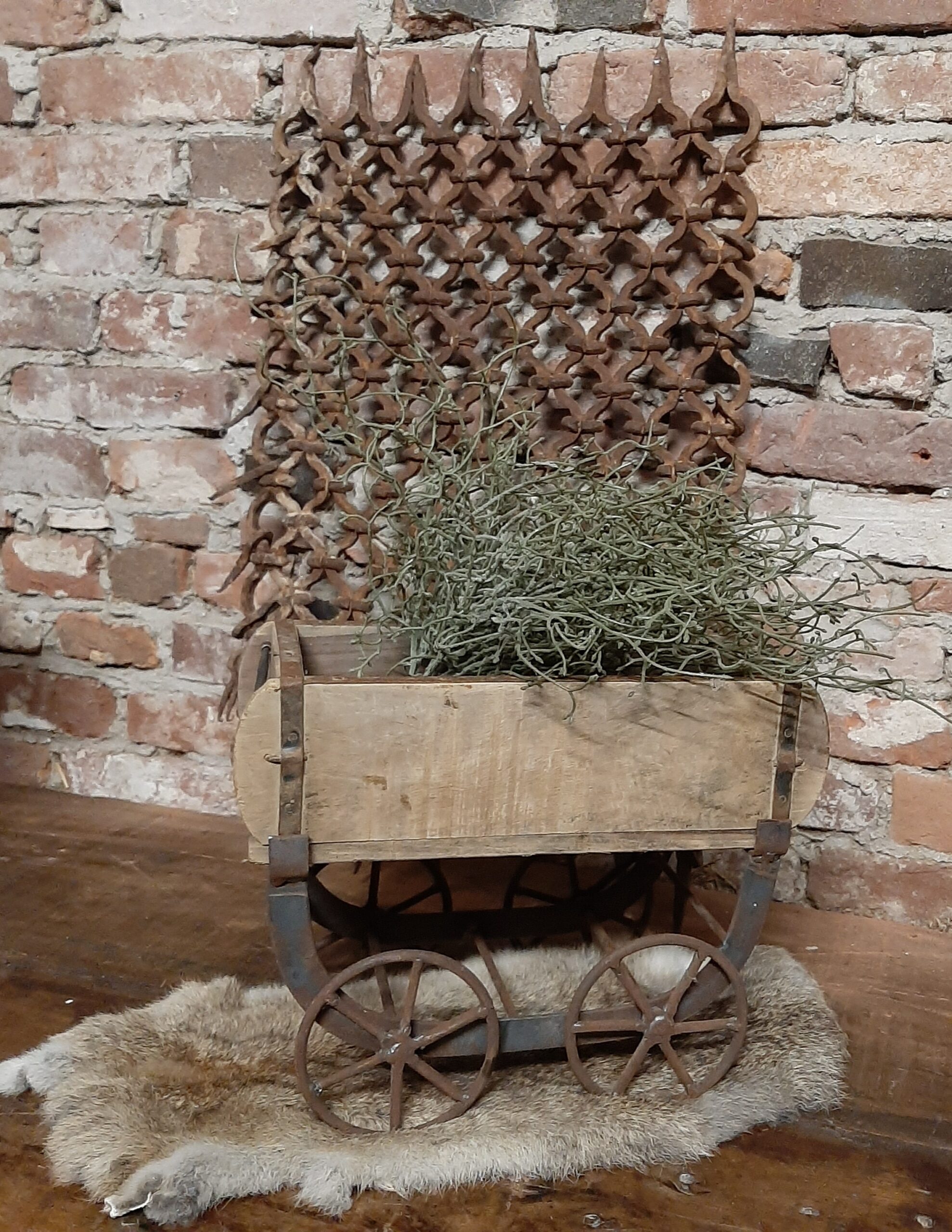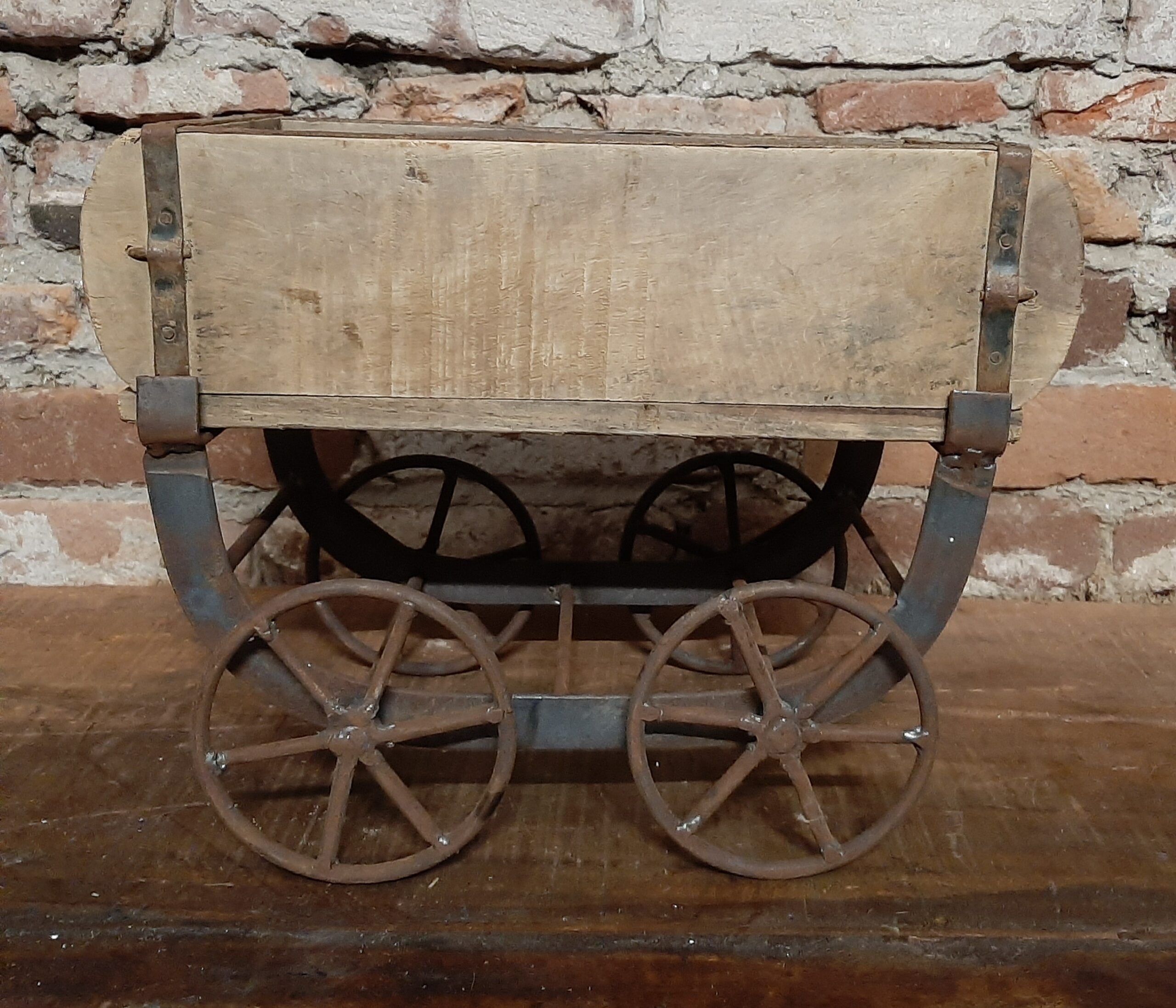 Deze decoratieve oude steenmal is voorzien van ijzeren wielen.