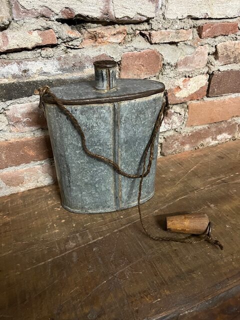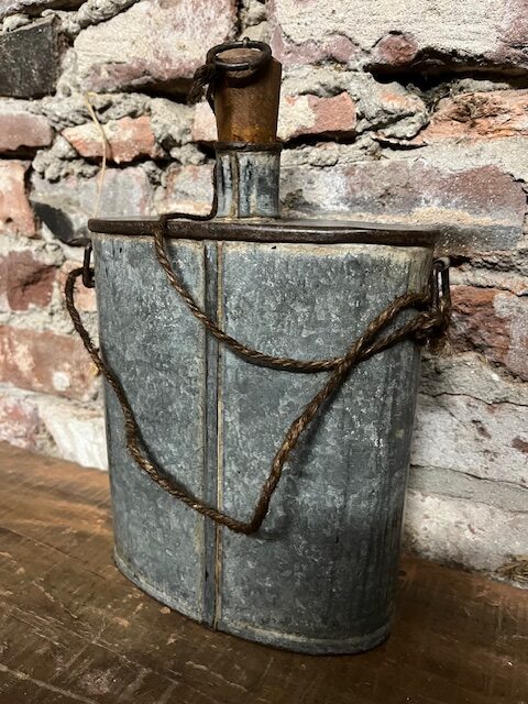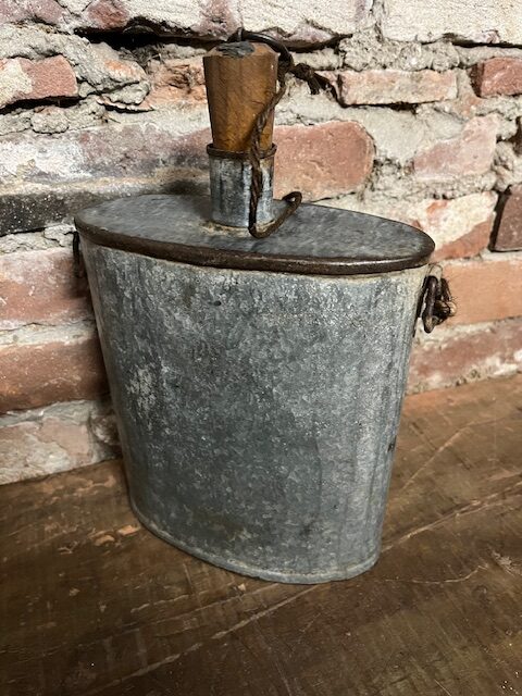 Deze oude metalen veldfles is een uniek en decoratief object met een doorleefde uitstraling. Oorspronkelijk gebruikt als wateropslag, heeft deze kruik door de jaren heen prachtige authentieke gebruikssporen ontwikkeld die zorgen voor karakter en charme.